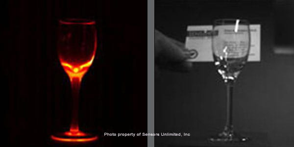 On the left, a hot wine glass is imaged in false color imaged simulating glass inspection using a Sensors Unlimited InGaAs camera. The signal levels can be calibrated to temperature; in this instance, the hottest part of the glass is 330ºC. On the right, the same glass at the same temperature is shown with a business card behind it, demonstrating that hot glass is completely transparent in the SWIR band.